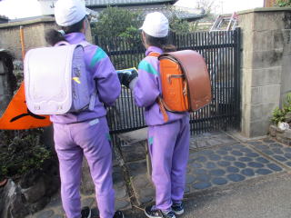 | 子ども110番の家は、いざというときに助けを求められる大切な場所です。子どもたちはそれぞれの「子ども110番の家」を訪ね、「いつも見守ってくださり、ありがとうございます。」と感謝の気持ちを持ちながら、確認していきました。また、6年生が書いてくれたお手紙を独居老人の皆さまにお渡しすると、「毎年ありがたい、うれしいわ。」と言って大変喜んでいただけました。また地区の子どもたちの顔を知っていただく機会にもなりました。 子どもたちは地域に支えられていることを改めて実感するとともに、自分たちの安全は地域とのつながりの中で守られているのだという意識を高めることができました。 |