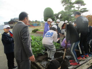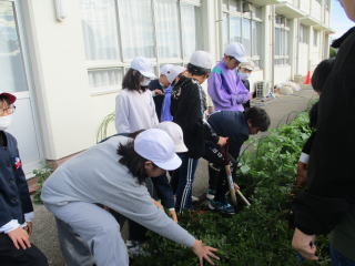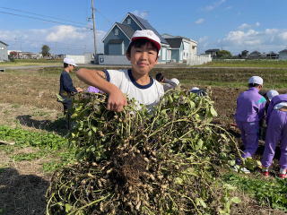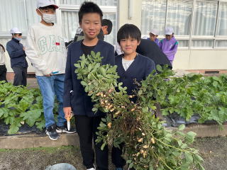 | 11月10日 6年 業間 11月11日 5年 始業前 春に植えた落花生が畑や花壇で大きく育ってたくさんの実をつけました。 |