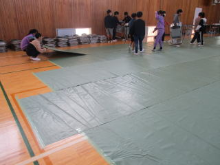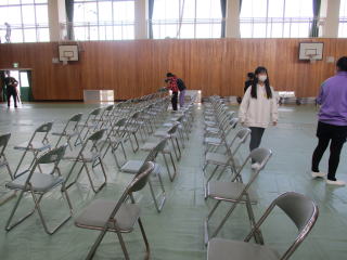 体育館内にシートをひいたり、パイプ椅子を並べたり、座席を拭いたり、体育館入口や外回り、トイレそうじをしてくれたりしました。