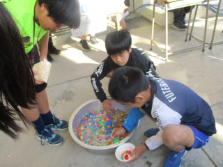 会場は地域の多くの人々でにぎわいました。 昨年度よりゲームコーナーを6年生児童たちが中心となって運営に参加しました。まちづくりのスタッフの方々と打ち合わせをして、ゲームの企画、当日のゲームコーナーの担当を6年生の子どもたちが中心になって行いました。今年度は4種類のゲーム(射的、スーパーボールすくい、ボーリング、ストラックアウト)をしてくれましたが、どのお店も大盛況でした。地域の方々とのふれあいを楽しみながら、一生懸命に働く姿がすばらしかったです。 |