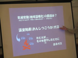 | 地球温暖化への対策として「使う電気の契約を再生可能エネルギーの電気に切り替えること(火力発電を風力発電や水力発電などに変える)はスマホで簡単にできる」とお話しされ、ほかにも、、地産地消、ごみの分別などをお話しされました。身近な人と温暖化を話題にすることが温暖化対策につながることであるのだと強く語られました。 もし、温暖化対策をしなければ2100年には最大4℃温度上昇する可能性があり、子どもたちが85歳くらいになると大変なことになるお話もしていただきびっくりした様子でした。目先のことだけでなく、未来にいい環境を残さないといけないことを改めて感じたとてもいいお話でした。 |