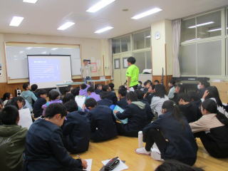 | 質問コーナー 「いまの仕事について嬉しかった子は?」「朝は何時に起きられますか?」 「今年のクリスマスや、お正月の天気は?」「防災士の資格を取られたのはどうして 」たくさんの質問がでましたが、一つ一つ丁寧にお答えしてくださいました。 |