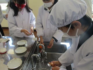 食器や使用した道具をサツマイモを茹でている間に洗っています。とても手際よく実習できるようになってきました。 |