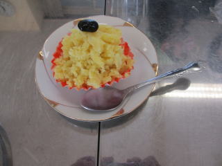 | カップに盛り付けたら、区と豆をトッピング!!おいしそうな黒豆入りのきんとんの完成です。 | ![]() |